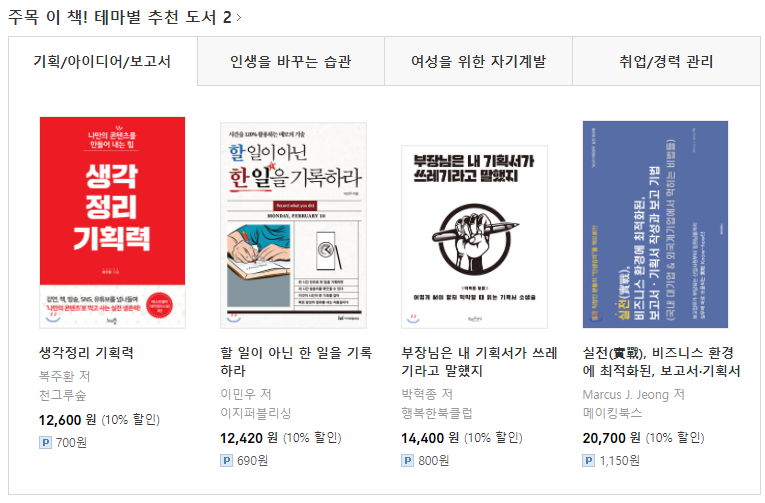 <실전(實戰), 비즈니스 환경에 최적화된, 보고서·기획서 작성과 보고 기법>이 예스 24 테마별 추천 도서에 올랐습니다!