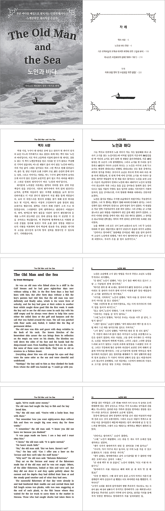 지금까지 여러 번역자들이 ‘노인과 바다’를 번역했지만 이번에 선보이게 되는 ‘노인과 바다’는 한결 새롭고 독보적이다. 한영본(한국어, 영어 순서)이며 원문에 등장하는 결코 만만치 않은 어휘들(특히 스페인어)을 사전을 일일이 찾는 수고 없이 읽을 수 있도록 잘 정리된 어휘편이 새롭다. 독자를 배려하는 마음이 크고 깊다. ‘기존 번역서들의 오역과 어색한 표현에 관한 정리’편을 읽어보면 그동안 우리가 ‘노인과 바다’에 관해 오해하고 잘못 알고 있었던 점을 명쾌하고 확연히 알 수 있게 된다.