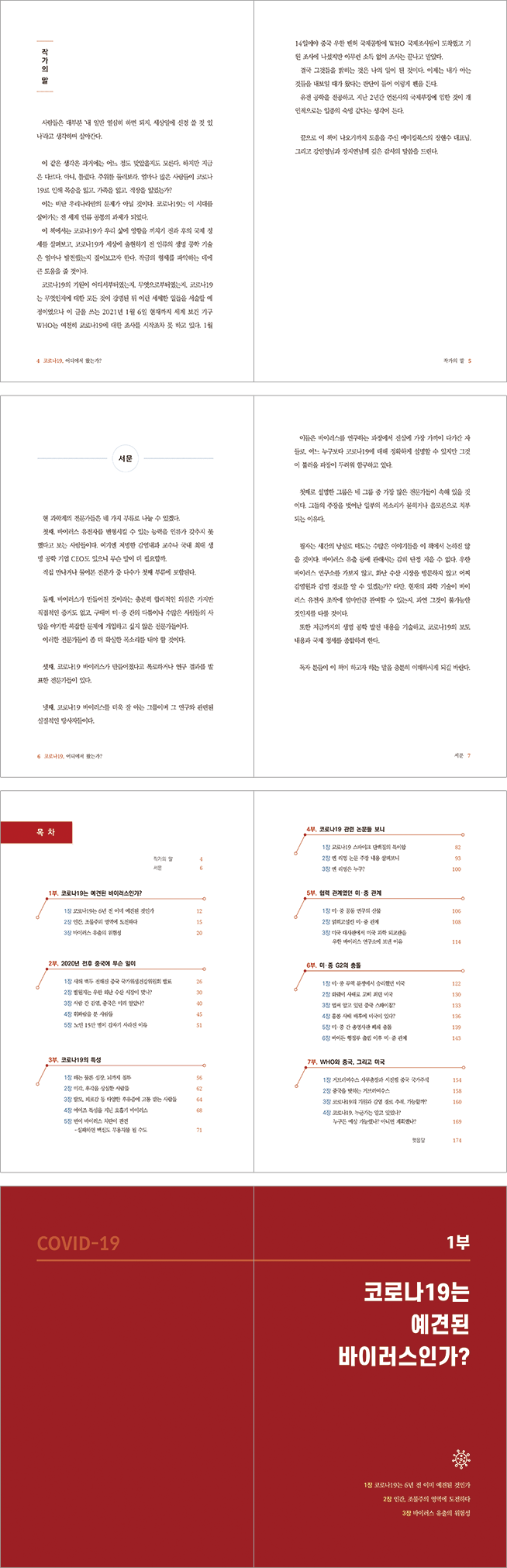 코로나19 바이러스 구조의 분자 생물학적 분석부터 미·중 무역 충돌과 같은 글로벌한 부분에 이르기까지. 미시와 거시를 넘나드는 저자의 통찰을 통해 우리 삶에 큰 영향을 주고 있는 코로나19와 그로 인한 정치·경제·사회적 파장의 해답을 찾을 수 있을 것이다.