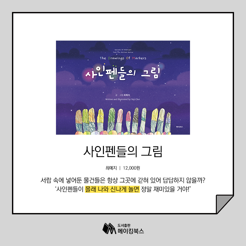 ‘서랍 속에 넣어둔 물건들은 항상 그곳에 갇혀 있어 답답하지 않을까?’서랍에 둔 사인펜들을 보며 아이는 코로나19로 인해 나가 놀지 못하고 집에만 있어 답답했던 것을 생각합니다. 몰래 집