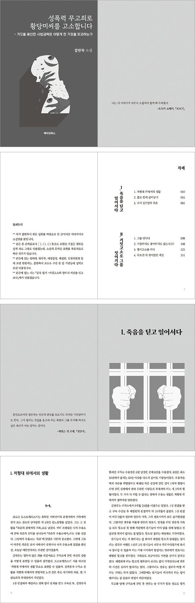 또한 작가는 이 소설이 “사악한 자의 거짓을 받아써 공소장을 작성하고 무책임한 태도로 일관한 검찰, 감정적 태도와 유죄추정으로 재판을 진행하고 고작 소설 같은 판결문을 쓴 판사를 향한 기록이기도 하다.”라고 밝힌다. 그러면서 절규한다. “수사기관이, 판사가 억울한 사람이 없도록 하겠다는 조금의 사명감과 어떤 쪽에 치우치지 않겠다는 공명정대함이 조금만 있다면, 사건 기록이 증거다. 처음부터 끝까지 천천히 읽어 보면 금방 드러난다(제발 미리 답을 정해놓고 그에 맞는 부분만 인용하지 마시라!!).”