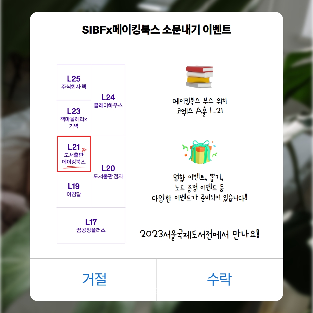 | [2023SIBF] 메이킹북스 부스 방문 이벤트! (0) | 2023.06.07 |